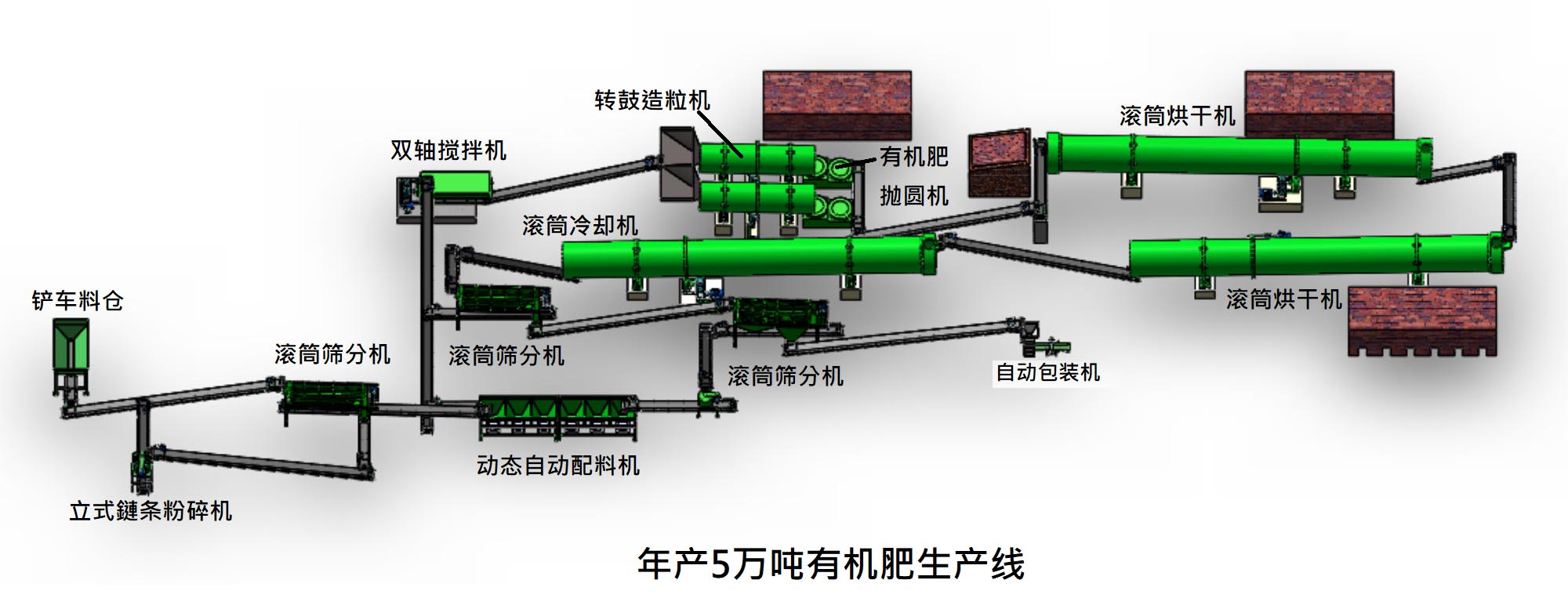 有機肥生產線設備主要包含一個料斗和喂料機,轉鼓造粒機,烘干機,滾筒篩分機,斗式提升機,皮帶機輸送機,包裝機和其他輔助設備。