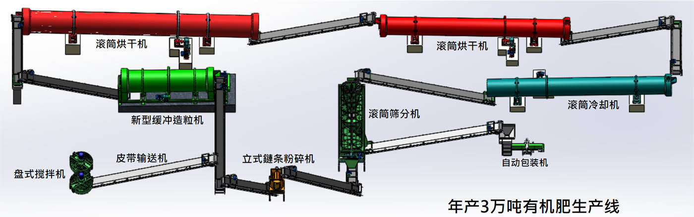 生產(chǎn)線設(shè)備包含發(fā)酵設(shè)備、攪拌機、造粒機、烘干機、冷卻機、滾筒篩分機、料倉、全自動包裝機、立式破碎機、皮帶輸送機等。