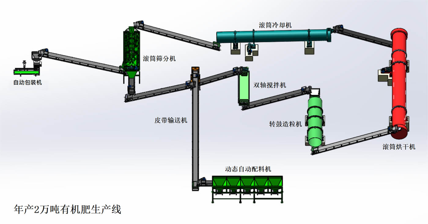 有機(jī)肥生產(chǎn)線主要由翻堆機(jī)、粉碎機(jī)、攪拌機(jī)、造粒機(jī)、烘干機(jī)、冷卻機(jī)、篩分機(jī)、包膜機(jī)、自動(dòng)包裝機(jī)等設(shè)備組成。